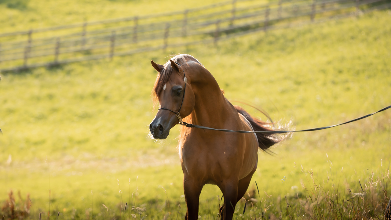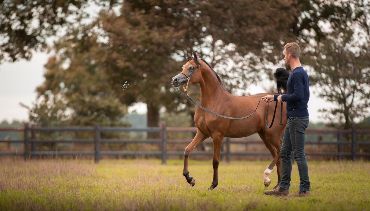 carrying her tail straight like a flag and with her huge movement she represents 100% the modern Arabian Type!